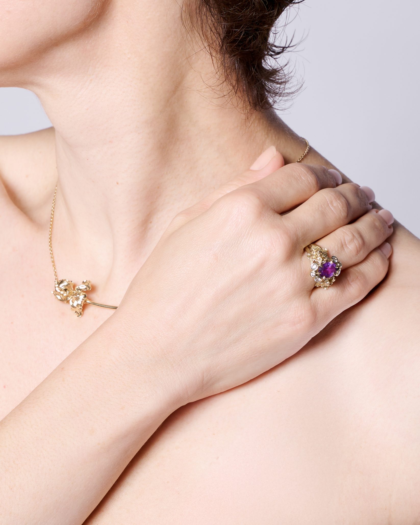 The aesthetics of the collection draw on the Pre-Raphaelites and the Victorian era, both of which regarded jewelry as ritual objects carrying hidden personal meanings. The delicate symbolism of the iris recalls Hesse’s description of golden hairs on its leaves as a pathway for beetles — which Janja reinterprets as a symbolic journey to the heart, to the inner self.