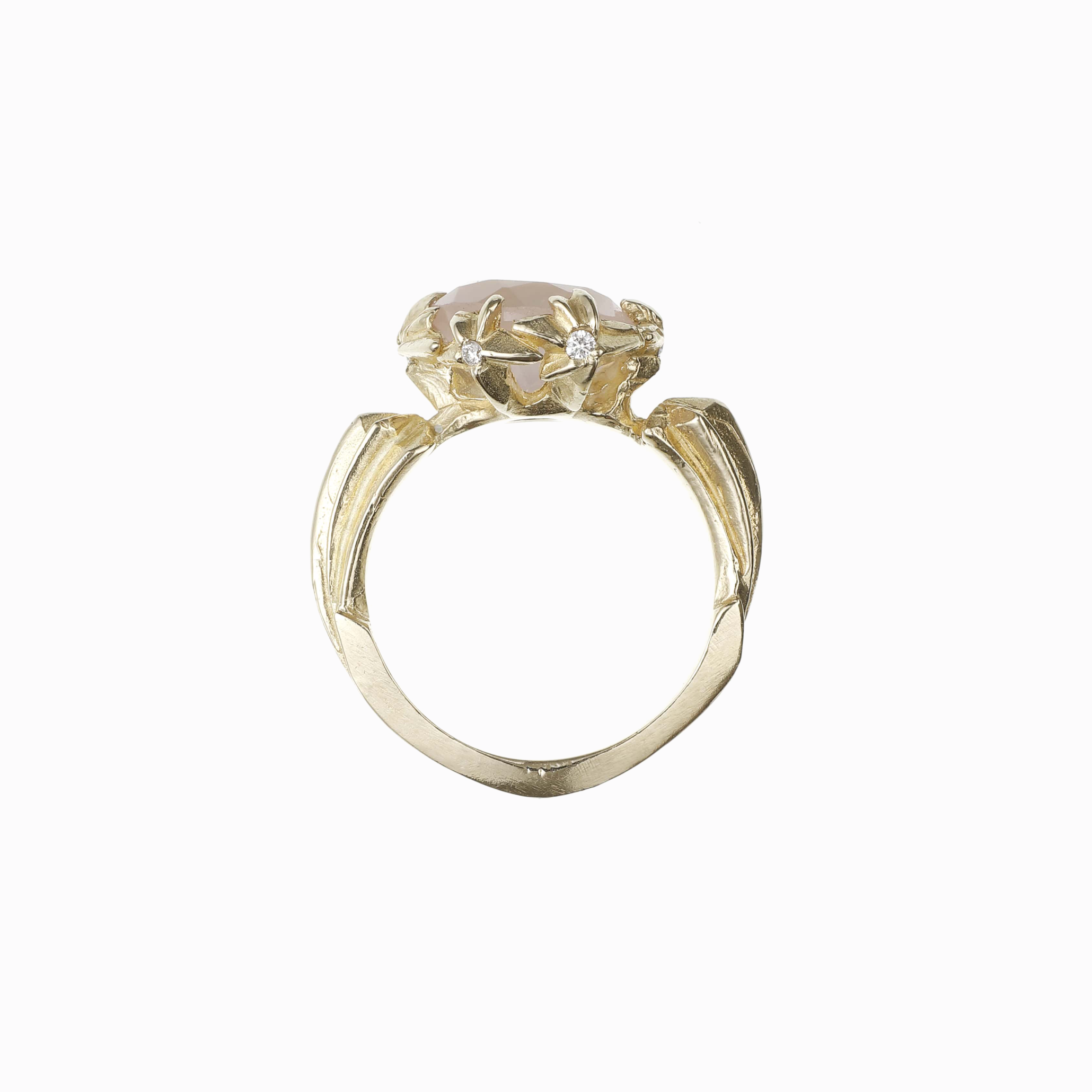 Vyrobeno ze 14K certifikovaného zlata s centrálním růženínem, osazené VS1-F diamanty.