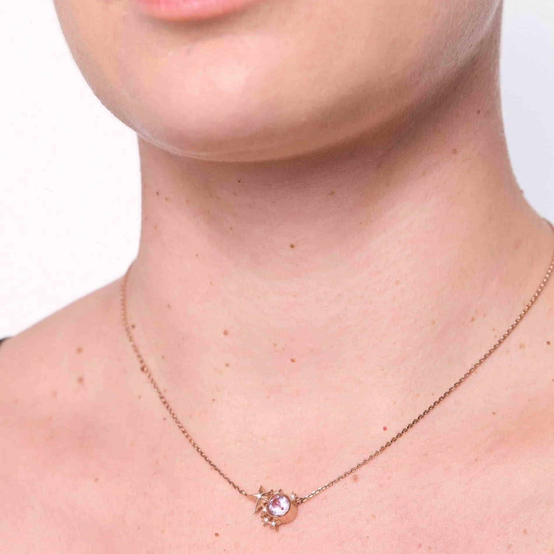 Dalším silným symbolem je les. „V mnoha mýtech a pohádkách je les místem transformace, kde hrdinové prochází zkouškami, a to vede k osobnímu růstu. Les může symbolizovat duchovní či psychologickou cestu, na které se jedinec mění a rozvíjí. Mnohé kultury vnímají lesy jako místa s vysokou duchovní energií,“ popisuje Janja. Hlavními kameny kolekce jsou akvamarin a růženín. Oba drahé kameny jsou spojeny s duchovním růstem a prohlubováním intuice, s pocitem klidu a rovnováhy. Akvamarín býval talismanem námořníků, kteří věřili, že je chrání na jejich cestě před nebezpečím moře. „Kámen je spojován s odvahou a ochranou, zejména při překonávání nebezpečí. Dokáže projasnit myšlenky a přináší klid a mír. Napomáhá schopnosti vyjadřovat se, dovolit si prožívat a tím se vrátit ke své autenticitě,“ říká Janja. Vedle akvamarínu je v kolekci Amor Fati důležitý růženín. Umí otevírat srdce, přijímat a vyjadřovat lásku. Je silně spojen s emocionálním uzdravením. „Dokáže zklidnit bolest a smutek, zahojit staré rány. Pomáhá přijímat se takoví, jací jsme,“ dodává šperkařka.