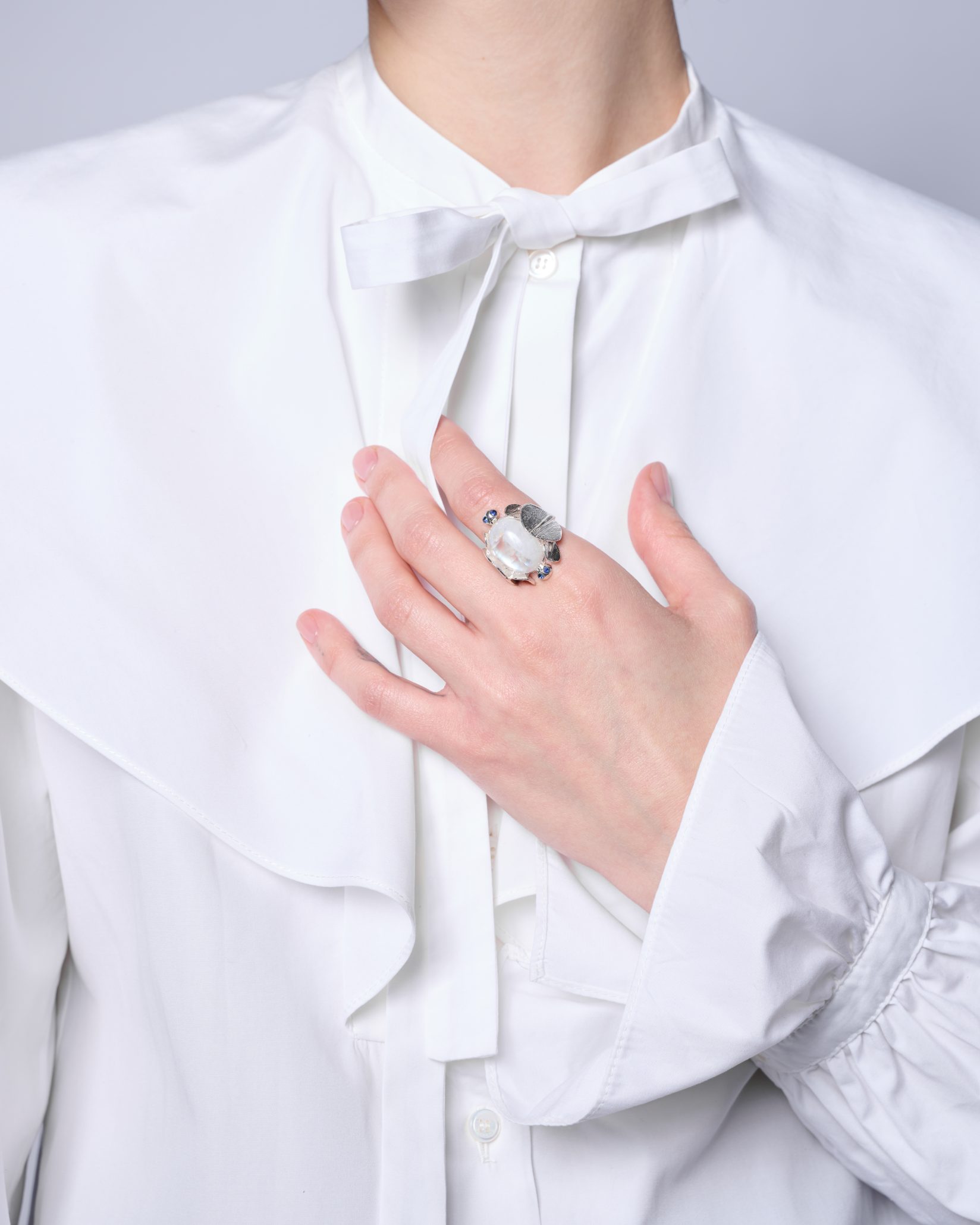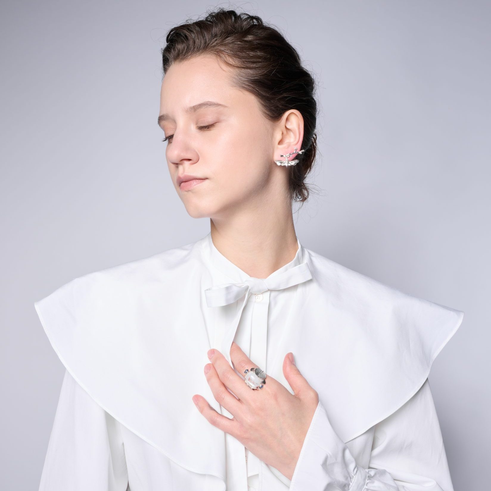 Vyrobeno ze stříbra s onyxem, doplněné o smaragdy.